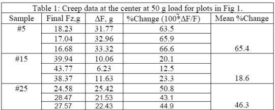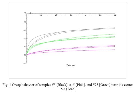 120초간 CREEP 시험(시험 편(試驗片)에 일정한 하중을 장시간 가함으로써 생기는 변형과 경과 시간과의 관계를 측정하여 크리프 강도 따위를 조사하는 시험.)을 하였고 아래 샘플 3가지에 대하여 3번의 반복시험을 한 결과, 각 시편은 반복성이 있는 결과를 보여주며, 검정색 5번시편이 CREEP 강도치가 가장 높은 결과 보여준다. 이 시험의 경우, 시험초기 50g 하중을 강제적으로 적용하고, 이후 로크웰 팁에 걸리는 하중의 변화를 120초간 측정하여 CREEP강도 시험을 편하게 하였다, 수직하중에 대한 수직으로 변형되는 변위를 측정도 가능하다.