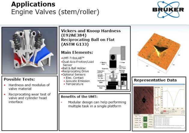 자동차 엔진 부품(밸브등)의 비커스 경도치와 실린더/피스톤의 마찰마모 시험이 가능하고, 로크웰 방식으로는 영하의 시험뿐 아니라 최대 1,000도씨까지 시험이 가능합니다.