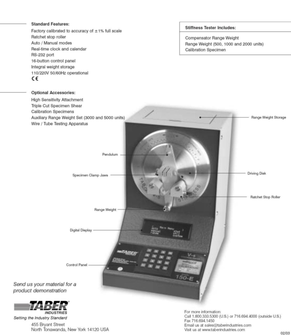 Taber® 비틀림 강성 장치 – 모델 108은 장갑 가죽의 상대 강성을 측정하는 데 사용되었습니다. ASTM D2821 (비틀림 와이어 장치로 가죽의 상대적 강성을 측정하기 위한 표준 시험 방법)에 설명된 디자인을 기반으로 하는 이 기기는 가죽 또는 기타 구부릴 수 있는 시편의 유연성과 강성을 측정하는 데 유용 합니다.